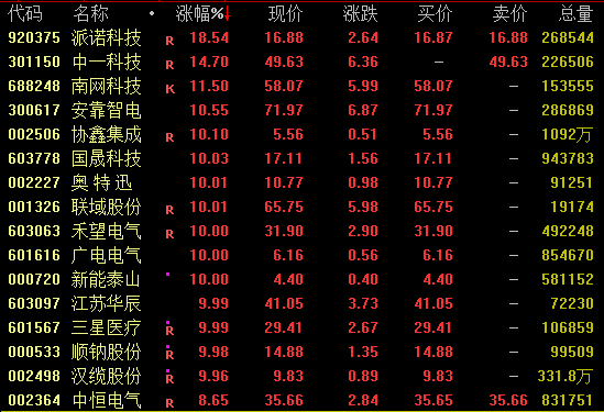 电气设备股盘中强势拉升,截至收盘,中一科技涨近15%,南网科技、安靠智电涨超10%,奥特迅、禾望电气、江苏华辰等涨停,顺钠股份再度涨停斩获3连板,中国西电涨超6%续创历史新高。